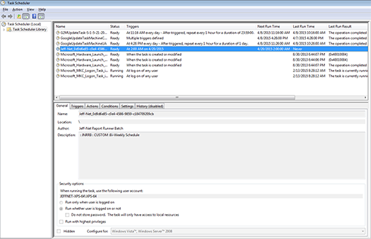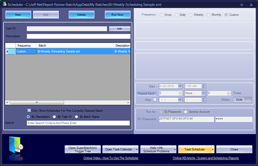 Scheduling in Report Runner Batch is quite easy. As you know (or maybe you don't know), our Report Runner Batch Scheduler utilizes the Windows Scheduler to run the schedules. The Windows Scheduler is super reliable (it's developed by Microsoft and is built-in to every operating system). Our Report Runner Batch Scheduler interfaces with the Windows Scheduler and handles all of the basics. In some cases though, you need access to more extensive scheduling options. In this case, we recommend using the