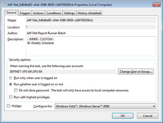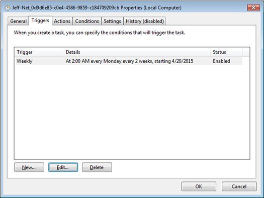 9. Note trigger now indicates weekly. Click OK and you are finished in the Windows Scheduler. If you created this task originally using your ID/password, it will prompt for you to confirm your password.