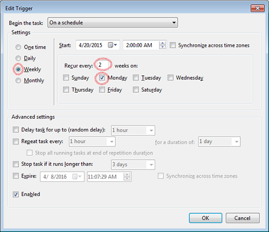8. Confirm starting date, change recurring to every 2 weeks, and set for Monday. Click OK.