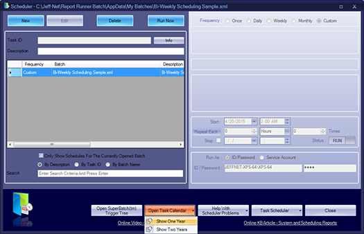10. Back in the Report Runner Batch Scheduler, click on OPEN TASK CALENDAR and select SHOW ONE YEAR.